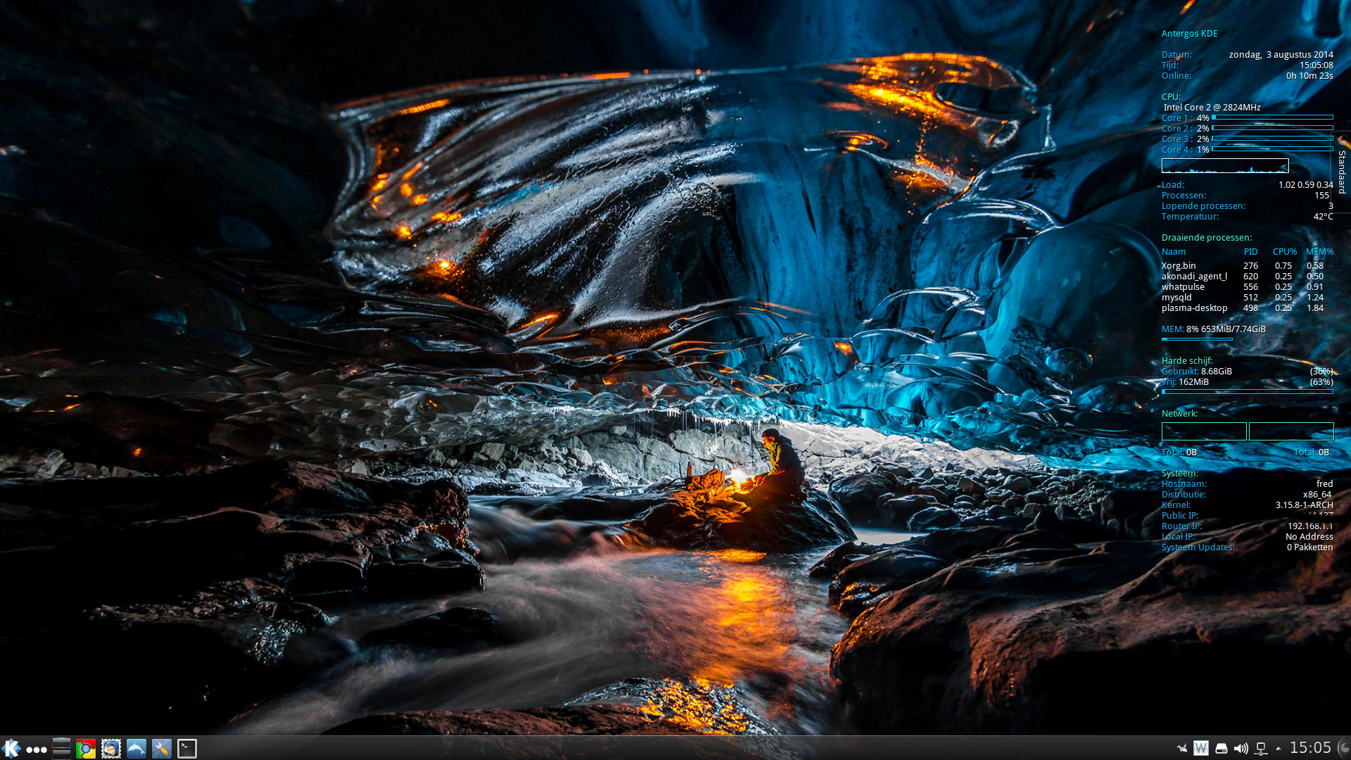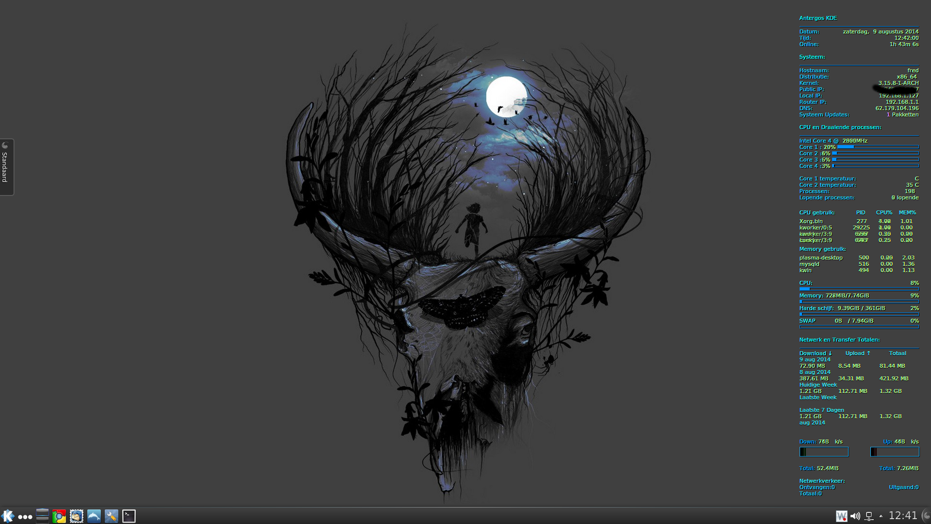 Ik gebruik hier antergos en gebruik conky. Ik weet dat het mogelijk is om je totale download en upload te loggen en te laten zien in je conky.